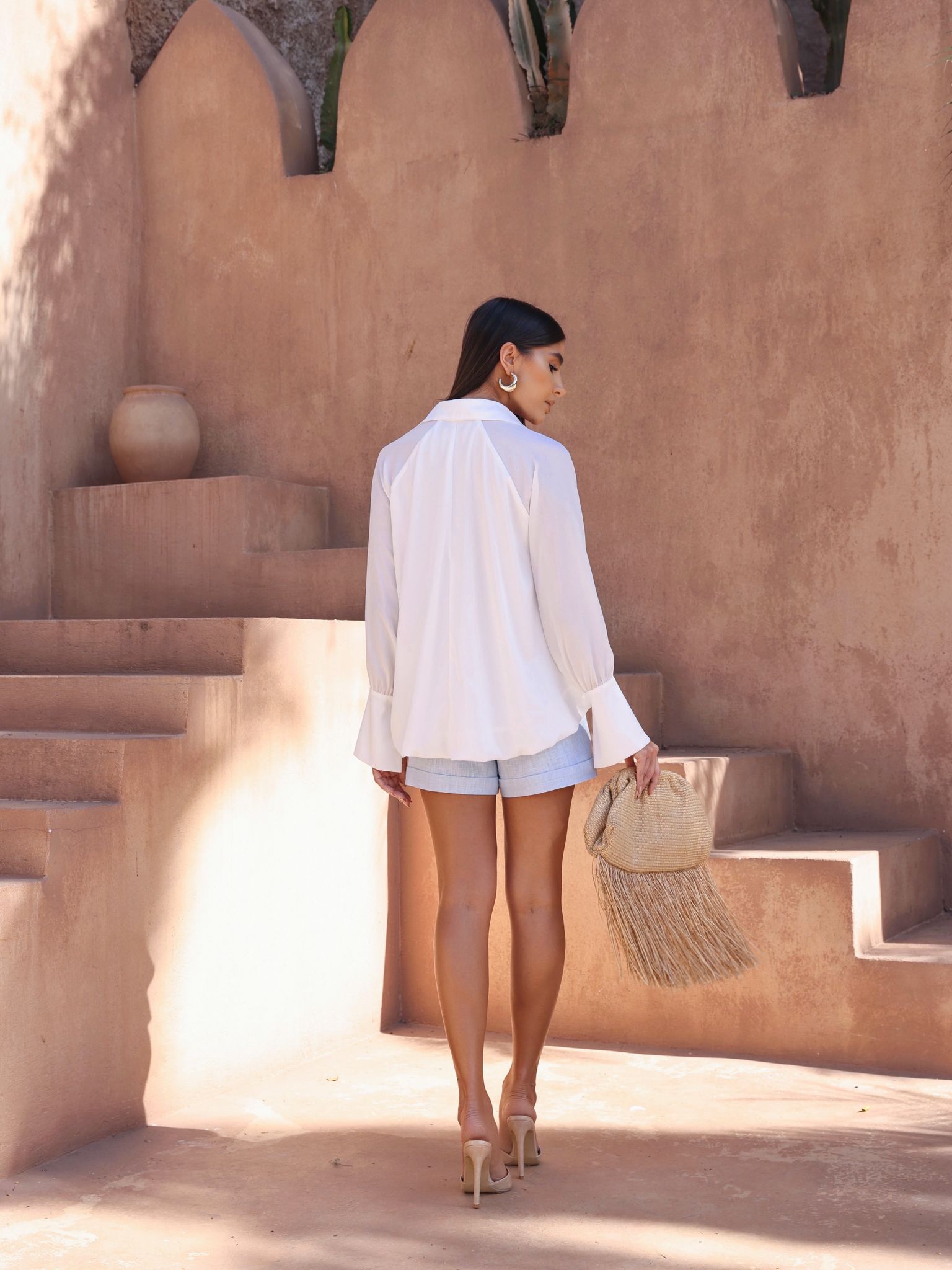 Com um caimento fluido e solto, ela apresenta um decote V sutil com detalhe de colarinho clássico. As mangas longas e amplas adicionam um toque dramático e refinado. Ideal para combinar com peças ajustadas, criando um equilíbrio visual contemporâneo.