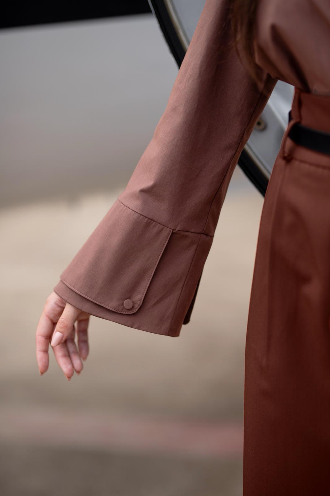 Punho Amplo e Estruturado: O destaque da peça! Os punhos largos e alongados dão um toque de alfaiataria diferenciado e contemporâneo, permitindo que a manga seja dobrada ou usada estendida para um visual dramático.