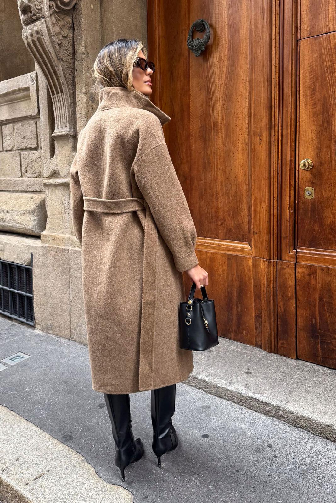 O design é elegante e atemporal, com uma silhueta reta e um comprimento que ultrapassa o joelho. Possui uma gola de lapela discreta e é ajustado na cintura por uma faixa amarrável do mesmo tecido, que define a forma. O tecido tem uma aparência melange (textura sutilmente mesclada), conferindo um toque de sofisticação e conforto, sendo ideal para sobreposições no frio.