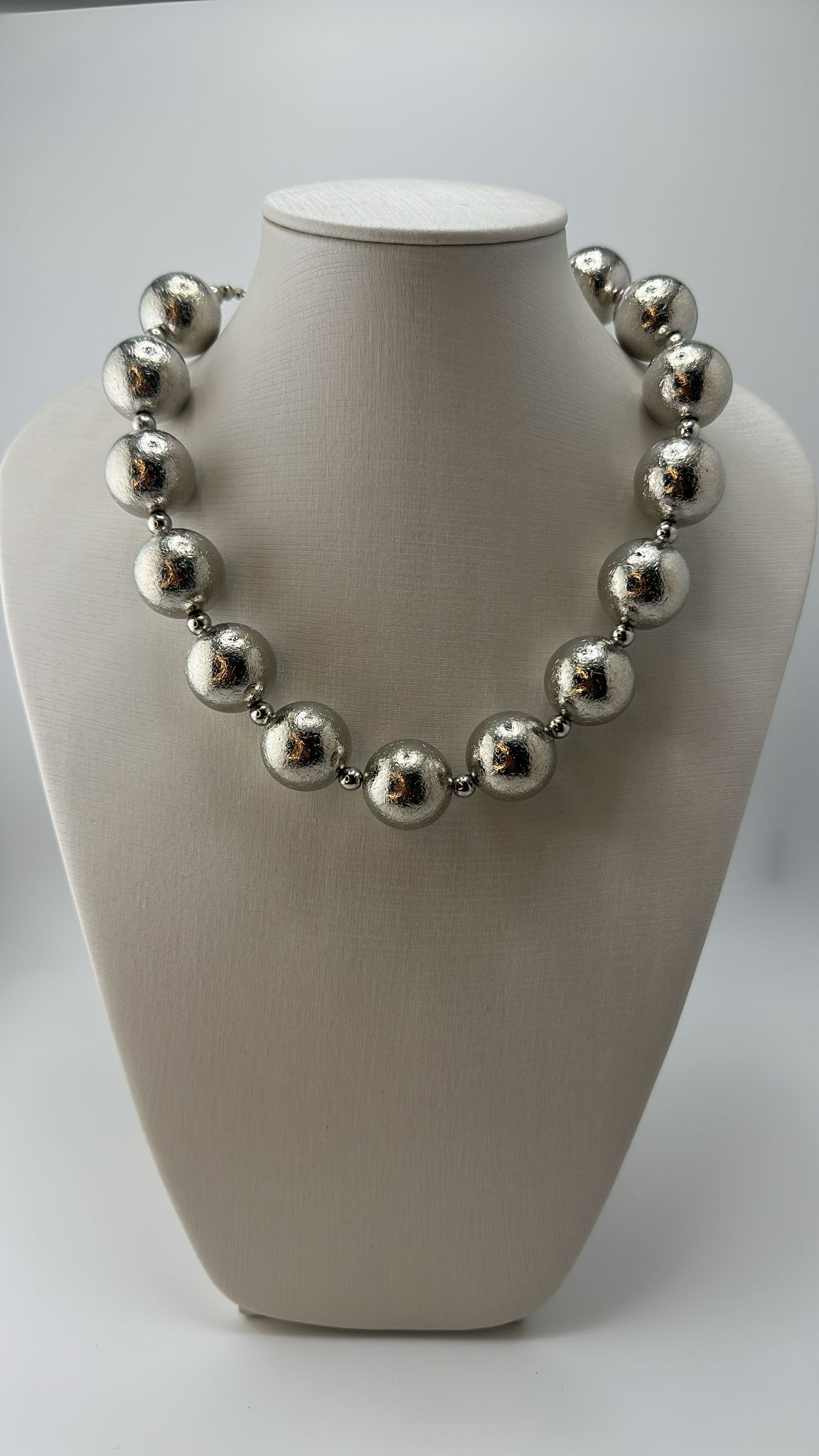 Este colar curto apresenta um design moderno e elegante, composto por uma fileira de grandes contas esféricas com um acabamento prateado texturizado, que cria um brilho único. As contas são unidas por elos pequenos e discretos, formando um acessório volumoso e sofisticado. É uma peça perfeita para adicionar um toque de glamour a qualquer look.