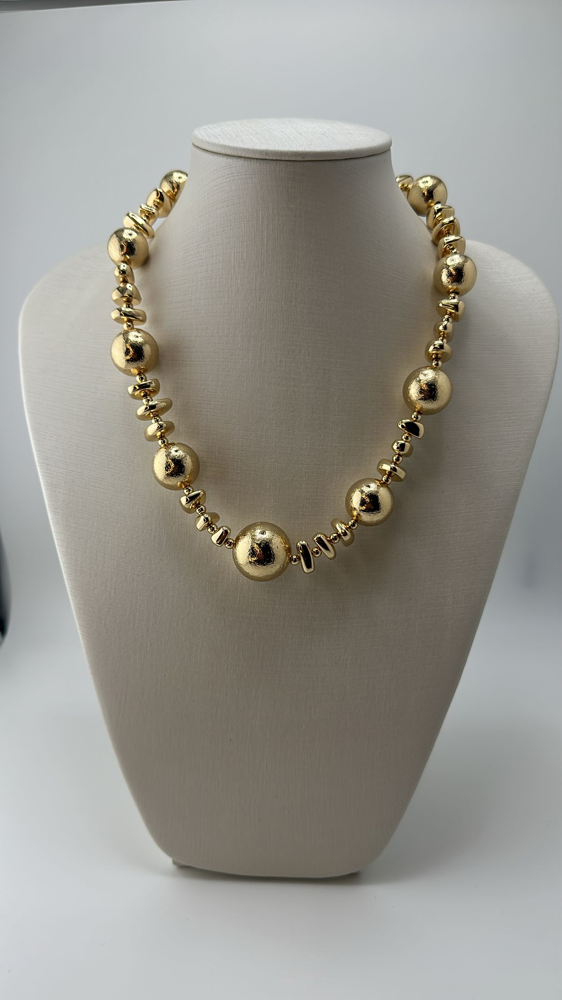 Este colar de design moderno e robusto é composto por uma fileira de contas com acabamento prateado brilhante. O colar intercala grandes esferas polidas com contas menores e irregulares, que criam um visual dinâmico e interessante. É uma peça perfeita para adicionar um toque de glamour e sofisticação a qualquer look.