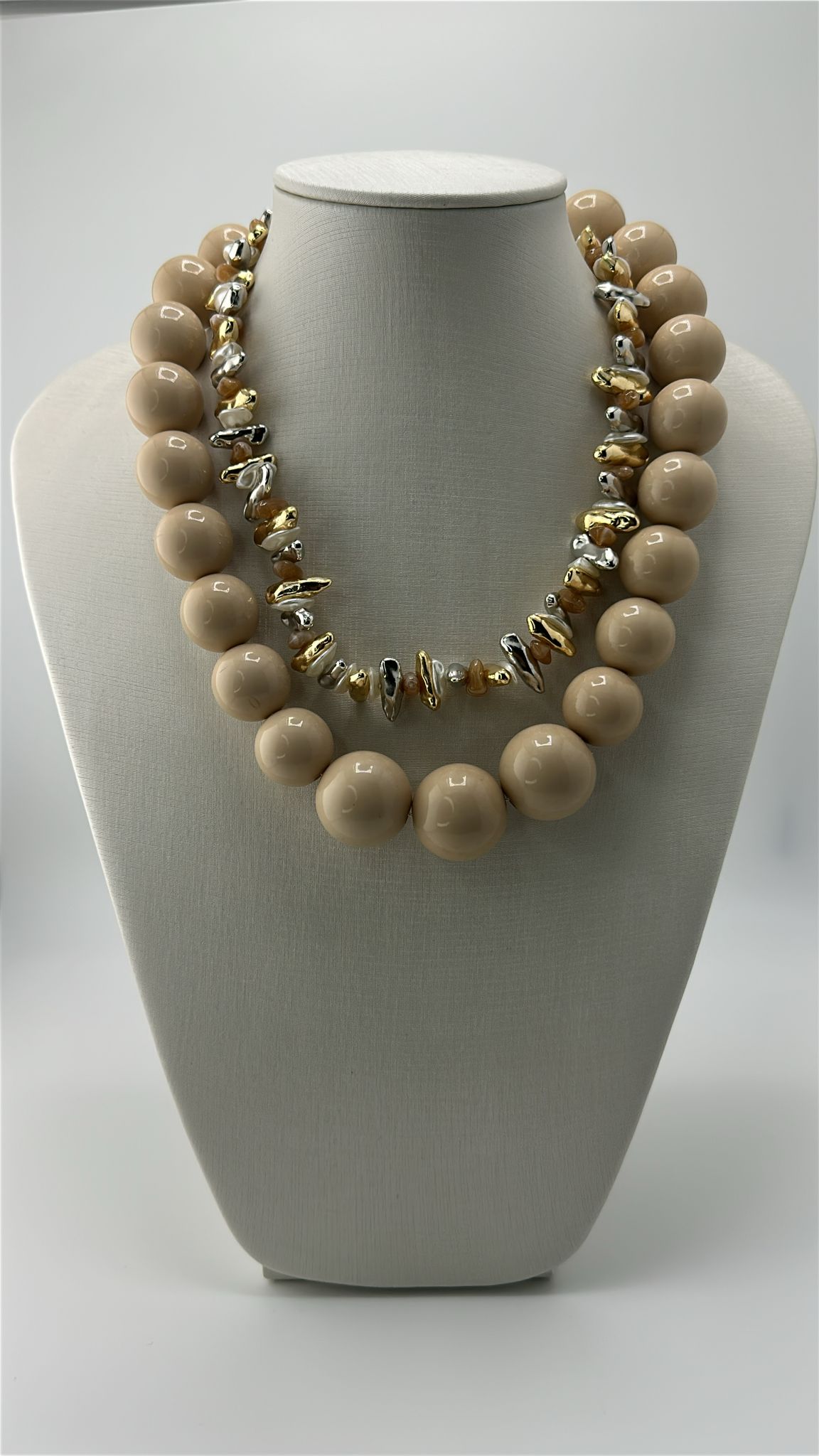 Este colar de duas voltas destaca-se por seu design volumoso e contrastante. A volta interna é uma mistura de contas de resina translúcida em tons de âmbar, combinadas com peças de metal polido nas cores dourado e prateado, criando um visual de texturas variadas. A volta externa é mais longa e é feita com grandes contas esféricas em um tom de bege-claro, com um acabamento opaco e suave. É uma peça perfeita para adicionar um toque de estilo e sofisticação a qualquer look.