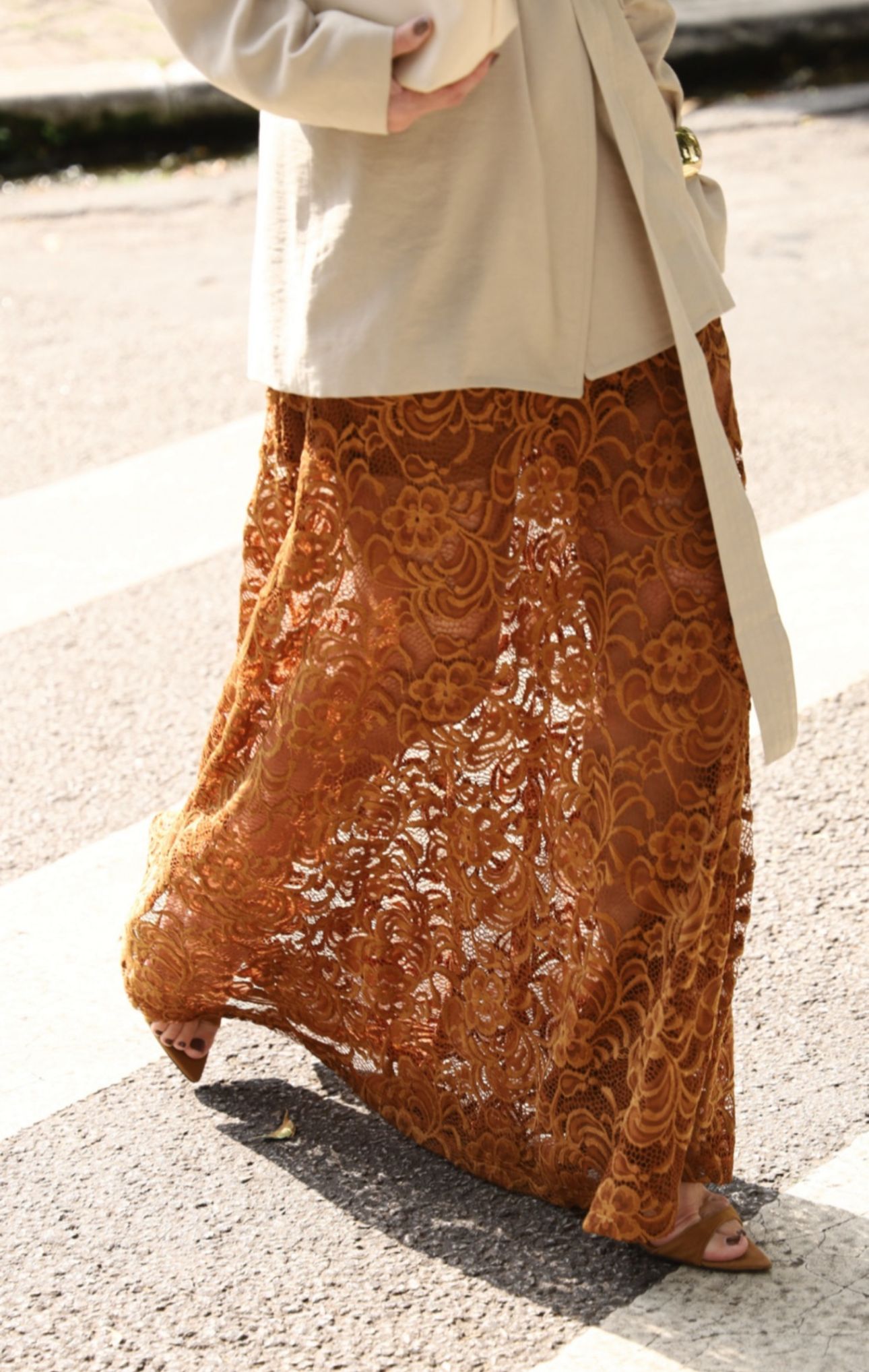 Eleve seu estilo com a nossa Saia Longa de Renda Eva, uma peça de tirar o fôlego que combina sofisticação, textura e uma cor terrosa super tendência. No deslumbrante tom Camel (Caramelo/Marrom-Avermelhado), esta saia é um item essencial para quem busca elegância e um toque de drama na medida certa.